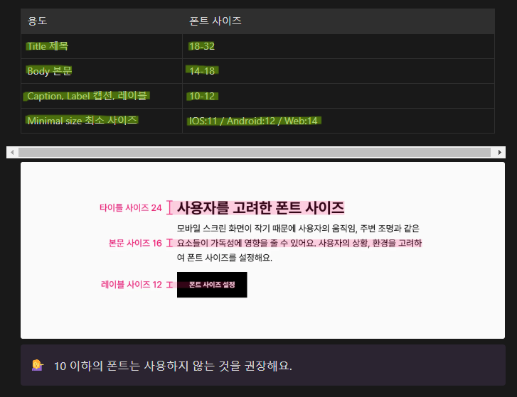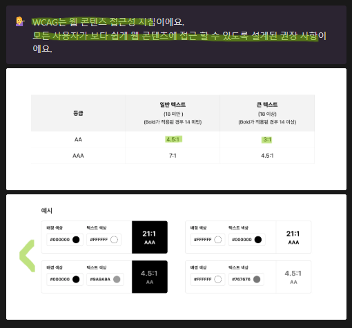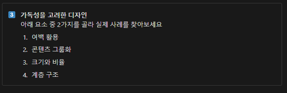 명도 대비 : 텍스트와 배경 색상 간의 충분한 대비를 제공해 시각적 접근성을 높여야 함