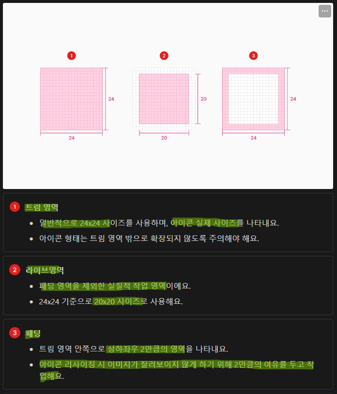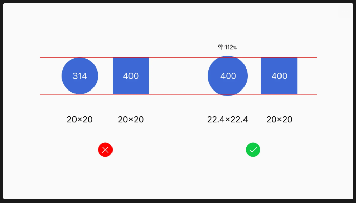 아이콘은 해상도에 따라 2, 3, 4배 리사이징이 되므로 사이즈 줄거나 늘어났을 때 소수점이 발생하지 않도록 작업하는 것이 좋음