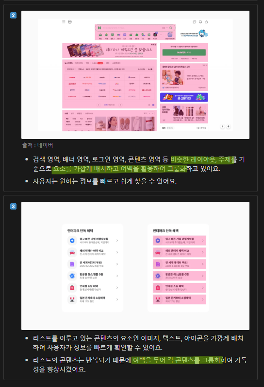 콘텐츠 사이의 여백 제공해 콘텐츠의 가독성을 높여 사용자가 콘텐츠를 쉽게 이해할 수 있게 도와줌