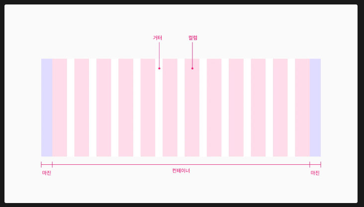디바이스 환경에 따라 디자인 요소를 일정 간격으로 배치, 크기를 부여해 체계적인 배열을 도와줌