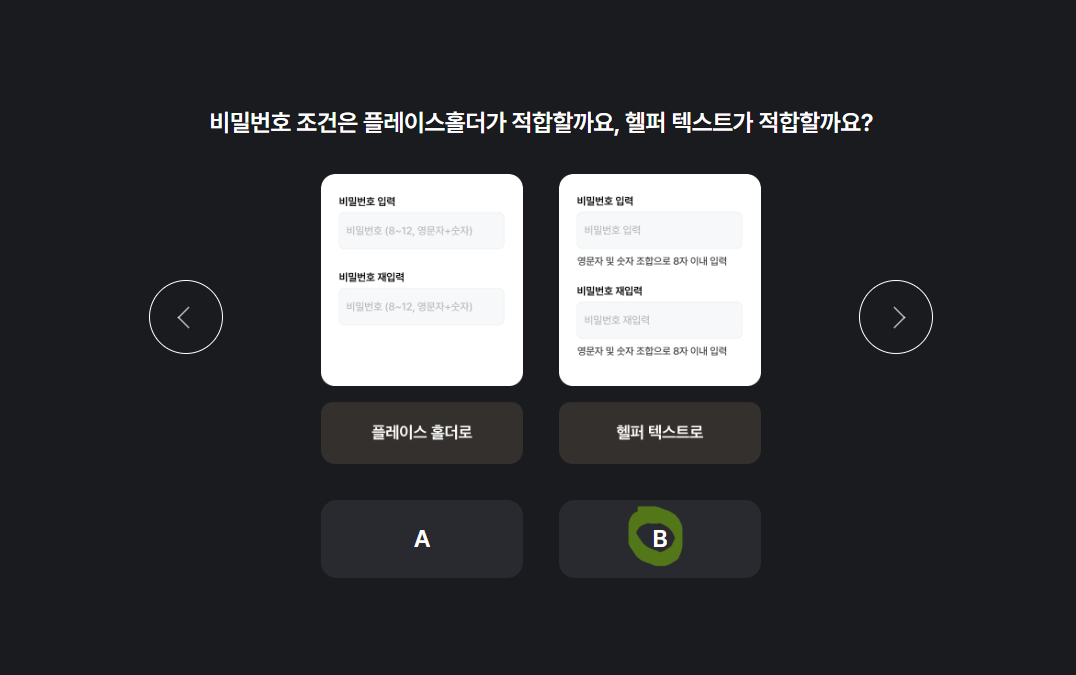 오늘의 토픽 - 비밀번호 조건은 플레이스홀더가 적합할까요, 헬퍼 텍스트가 적합할까요?