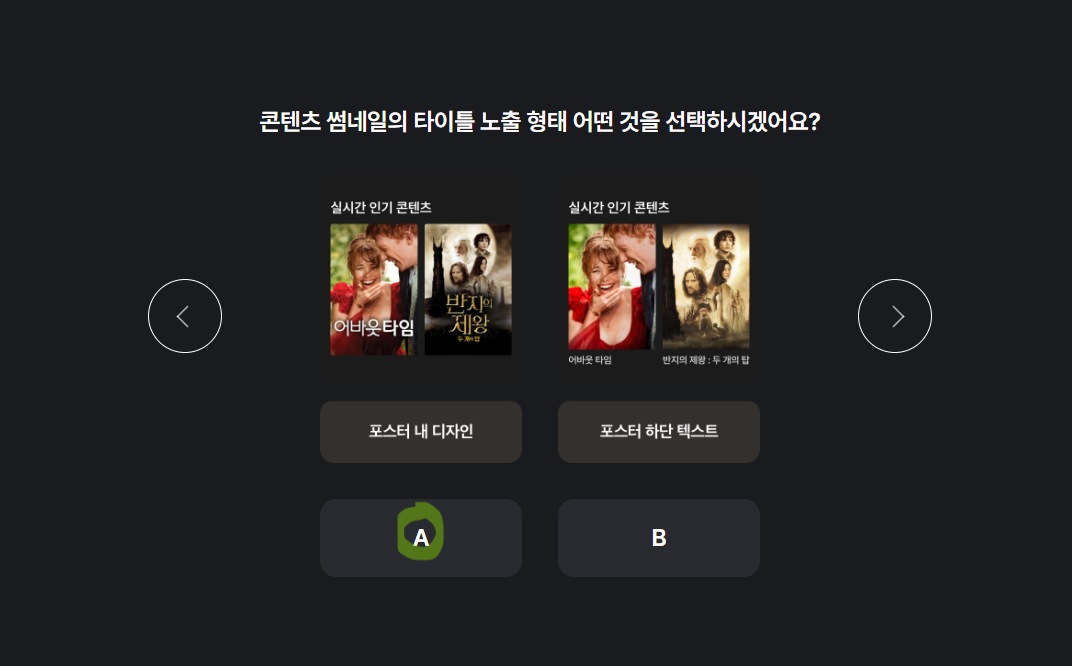 B안의 경우 콘텐츠 타이틀만 보이게 되어 이게 과연 무슨 콘텐츠인지 인지하기가 어렵고 단순히 제목과 포스터로 유추해야 하기 때문에 제목과 포스터에서 마음에 들었어도 눌러서 콘텐츠의 소개 항목을 확인하고 맘에 들지 않는 콘텐츠라면 다시 나와야 하는 불상사가 생기므로 이동이 빈번해져서 불편함