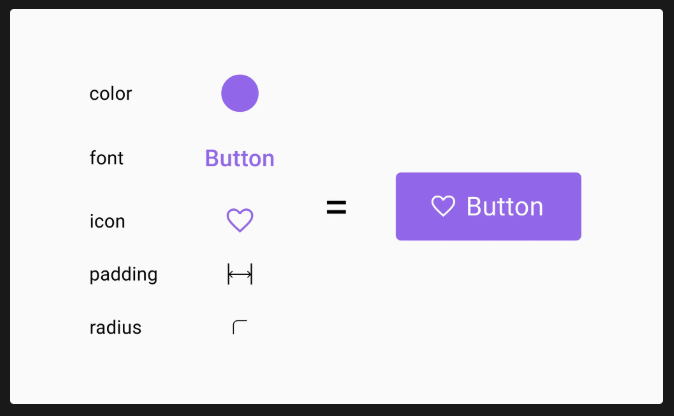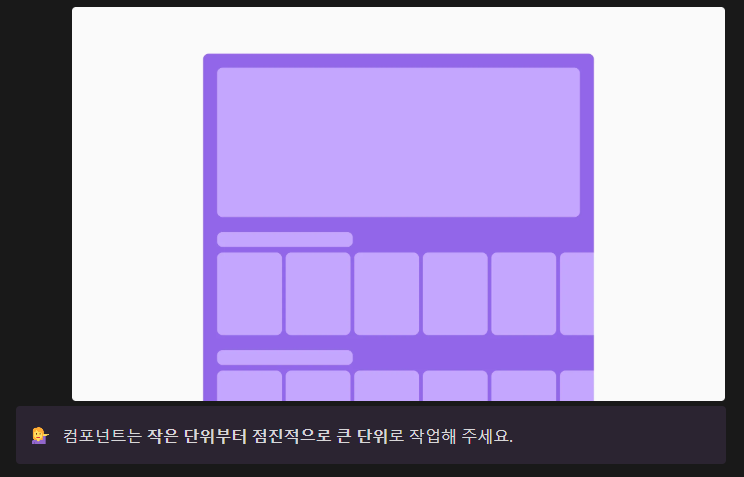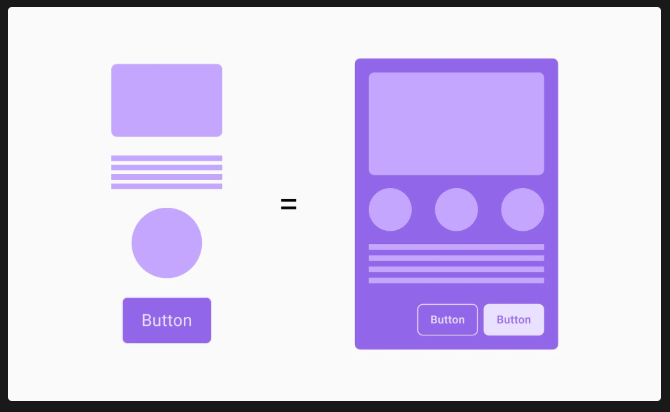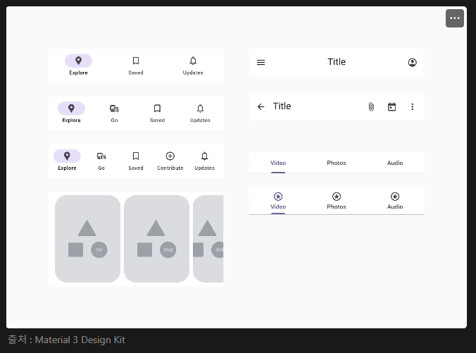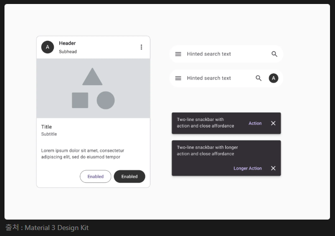 카드(이미지 + 텍스트), 서치바(아이콘 + 입력 필드), Snackbar(텍스트 + 버튼) 등