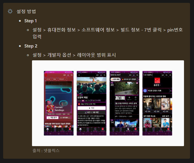 안드로이드의 경우 개발자 모드로 접속해 레이아웃 구조를 확인할 수 있음