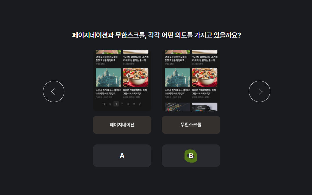 스크롤의 경우에는 스크롤만으로 콘텐츠를 확인할 수 있고 스크롤이 있는 경우 카테고리가 따로 있기 때문에 인기나 추천 콘텐츠를 읽은 후에 카테고리로 따로 찾을 수 있다고 생각하여 B를 골랐음