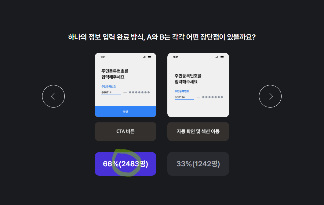 B안을 선택하지 않은 이유로는 자동적으로 확인하여 섹션을 이동하면 실수로 주민등록번호를 잘못치는 경우