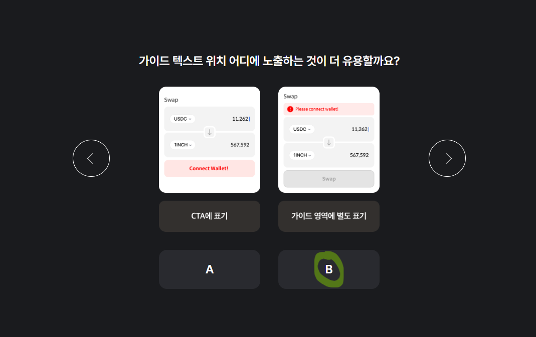 A안을 선택하지 않은 이유로는 CTA 버튼에 가이드 영역 활용 시 버튼이라는 인지가 떨어질 수 있을 것이라 판단했고 B안이 눈에 더 잘띄는 것 같음