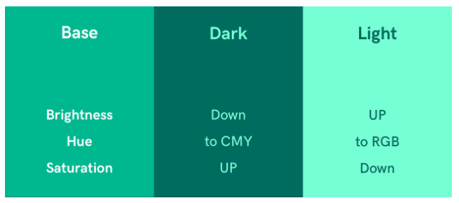 이 때, 주색보다 밝은 색, 주색보다 어두운 색을 정의하는데 밝기-채도-색조 순서로 색 변형
