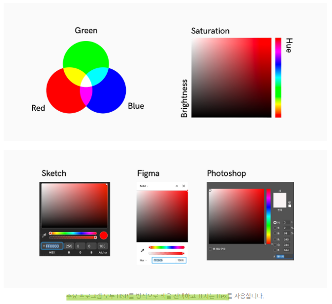디지털 프로덕트에서 색은 주로 RGB, HSL, HSB 등, 작업 시 HEX, RGB를 주로 사용