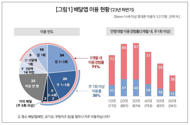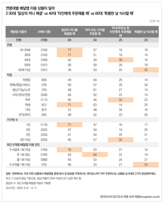 특히 ‘끼니 해결’ 응답은 20~30대(18-29세 77%, 30대 71%)와 1인 가구(71%), 학생층(71%). 3-4일에 1회 이상 배달앱 이용층(76%)에서 상대적으로 높음
