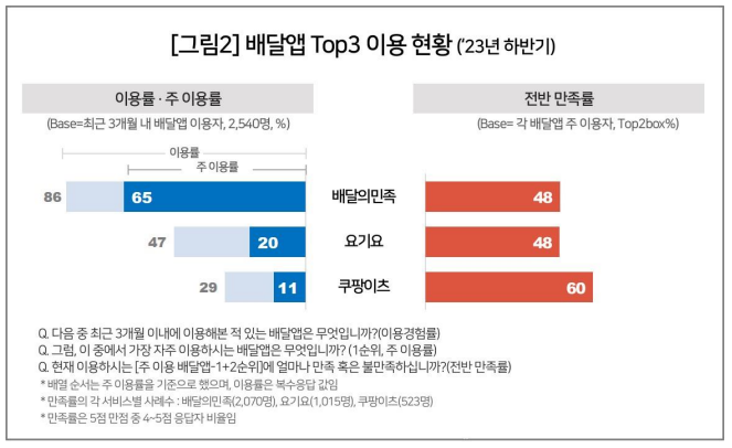 쿠팡이츠가 전반 만족률 60%로 배민과 요기요(각각 48%)를 크게 앞서 1위를 차지함