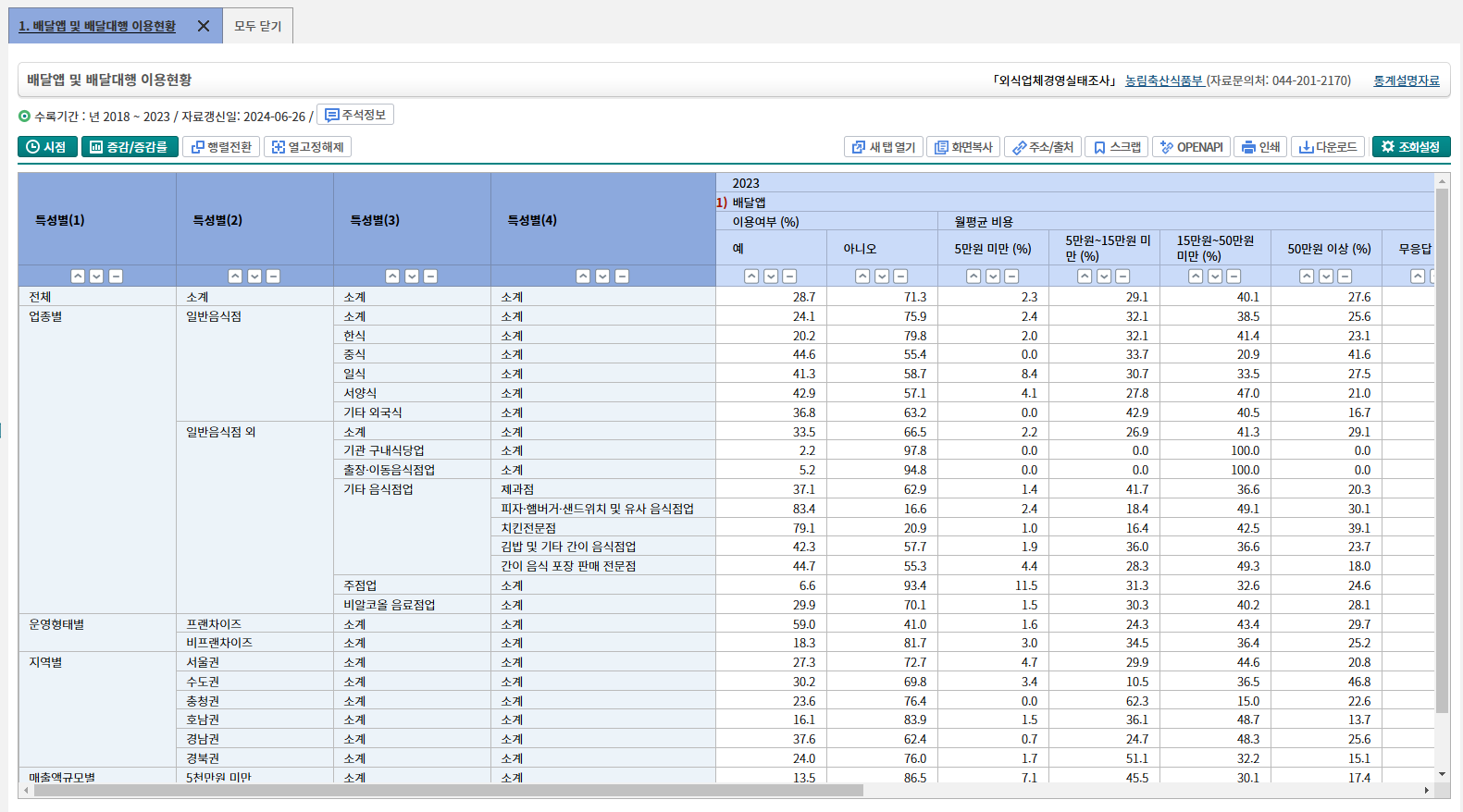 KOSIS 국가통계포털 - 배달앱 및 배달대행 이용현황