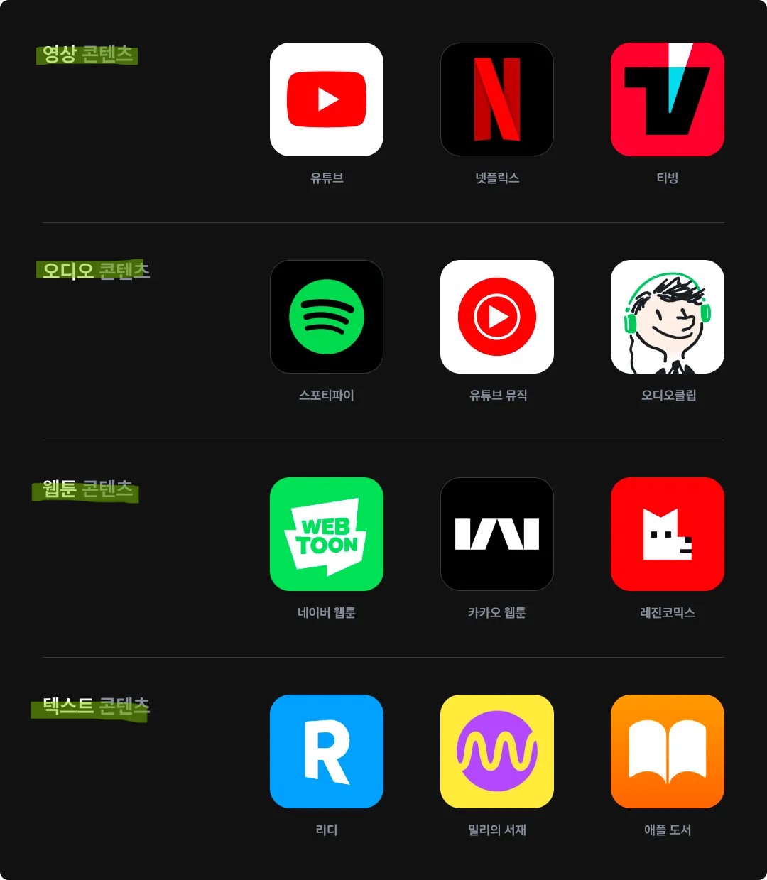 콘텐츠의 종류에 따라 영상, 오디오, 텍스트, 웹툰 등 다양하게 나눠지고 각 종류의 특성에 따라 차이가 큼