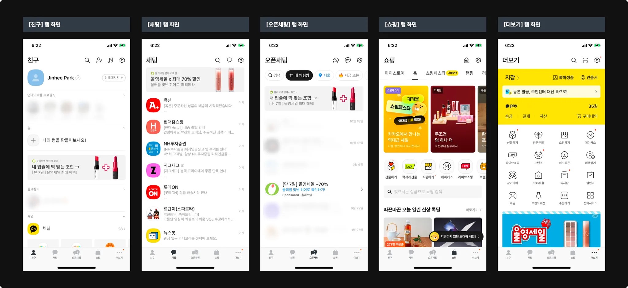 친구, 채팅, 오픈 채팅 광고 배너와 더보기 광고 배너 및 다른 기능의 폰트 스타일도 다르며. 탭 간의 아이콘 등의 일관성이 부족함