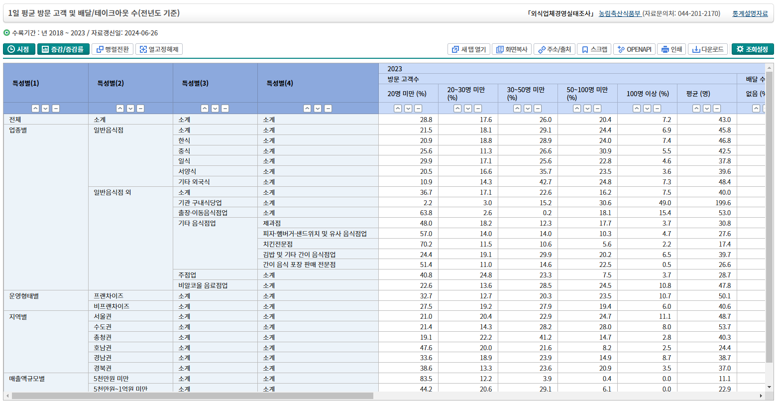 KOSIS 국가통계포털 - 1일 평균 방문 고객 및 배달/테이크아웃 수(전년도 기준)