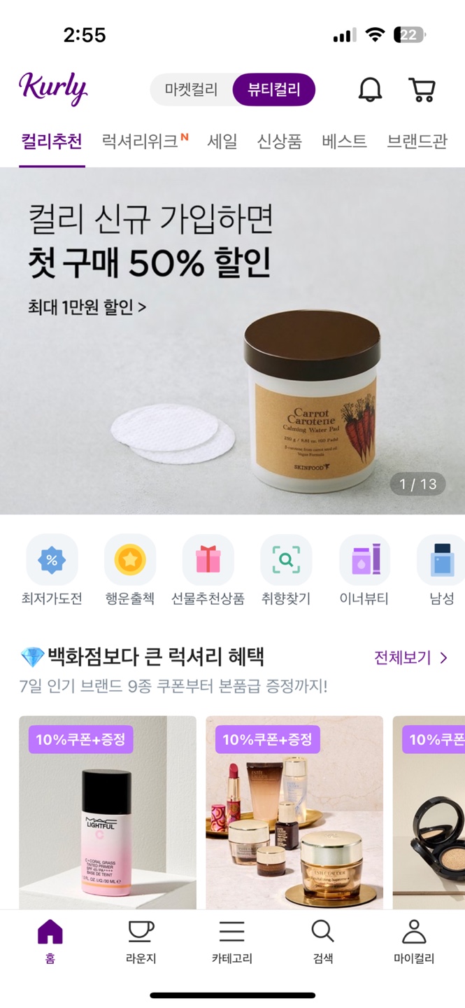 컬리 같은 경우는 마켓컬리와 뷰티컬리를 나누어서 운영을 하고 있는데 상단에서도 마켓과 뷰티간 전환이 가능하며 카테고리에서도 변경이 가능하며, 검색 같은 경우 마켓 컬리는 검색, 뷰티 컬리는 뷰티 검색으로 표기하여 헷갈리는 걸 방지함