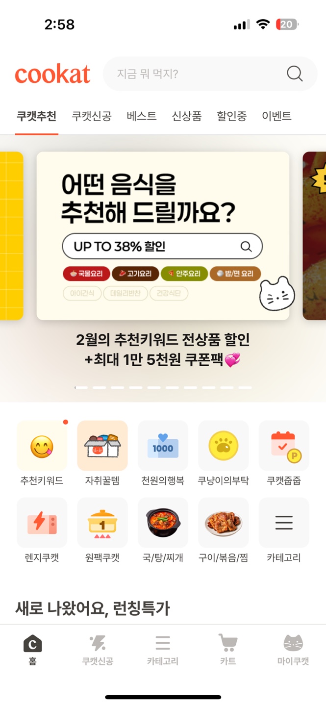 쿠캣에는 박스 버튼에 이벤트를 사용하므로 이벤트를 홍보하는 역할을 하는데, 다소 낯선 시도이지만, 시각적으로 만족스러운 디자인은 사용성의 문제를 가림