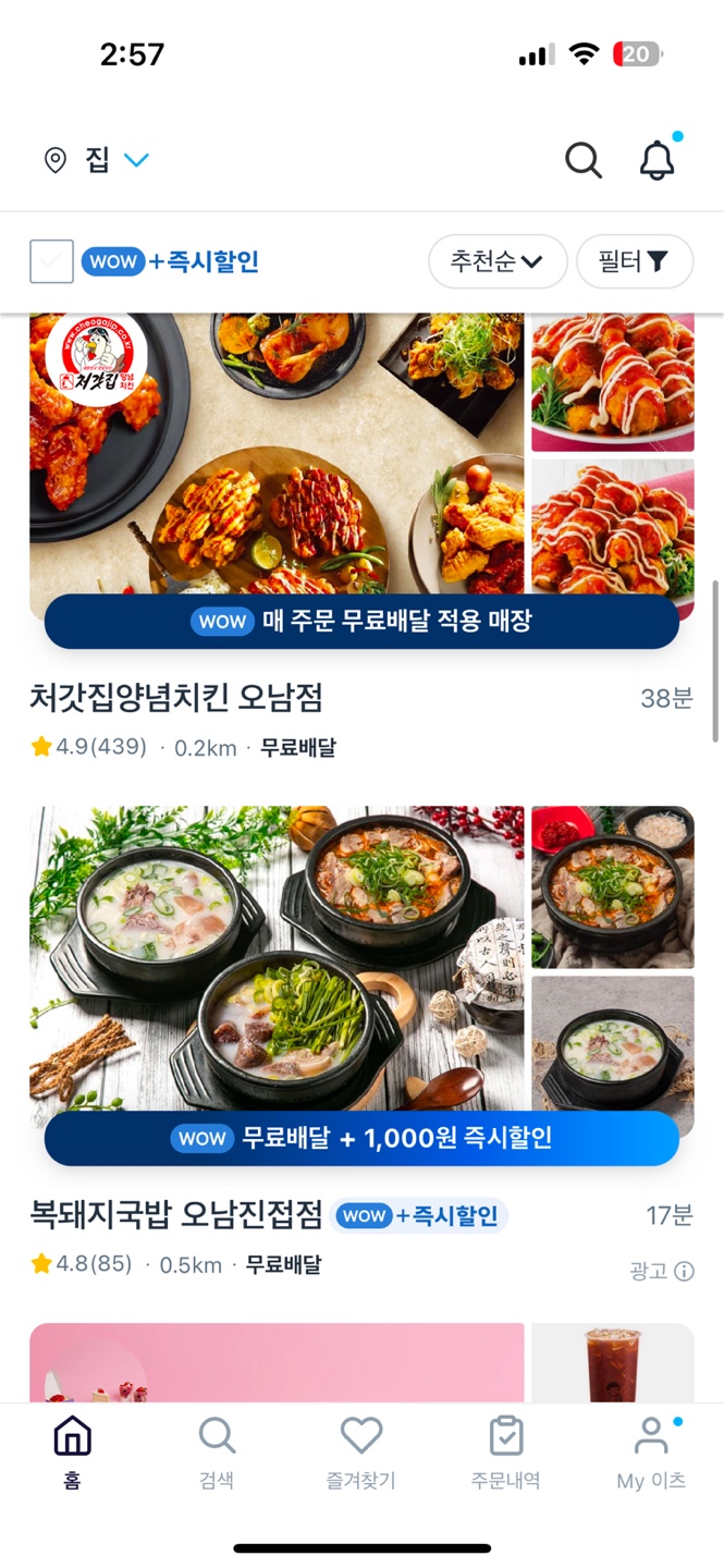 더미버튼에 색상 차이를 둠으로 무료배달이 아닌 곳은 더미버튼 표기가 없으며 무료배달인 곳은 파랑, 할인이 있는 경우 그라데이션으로 표기하여 타 앱에 비하여 쿠폰 유무를 알기 쉬움