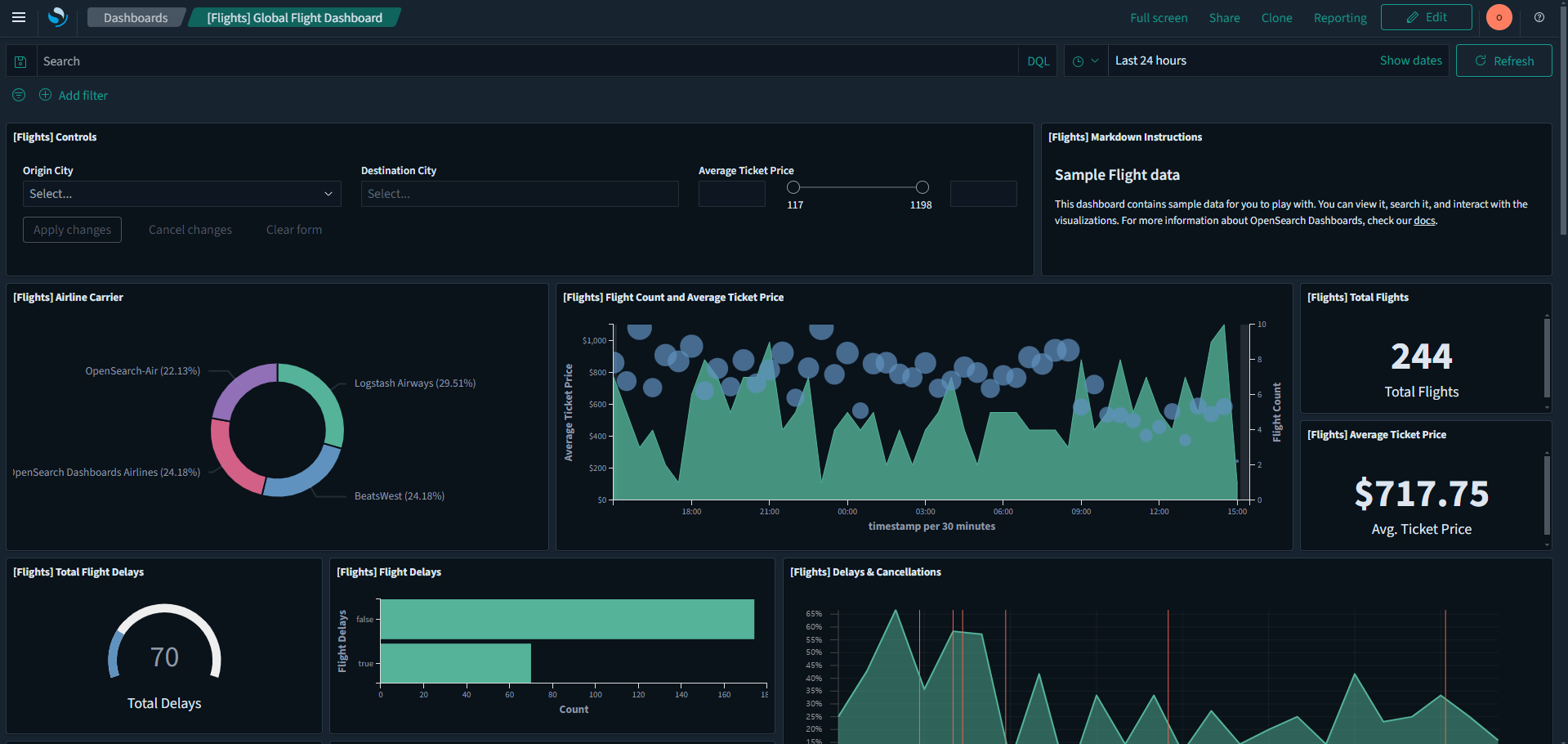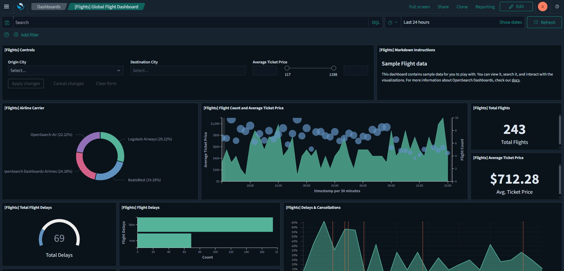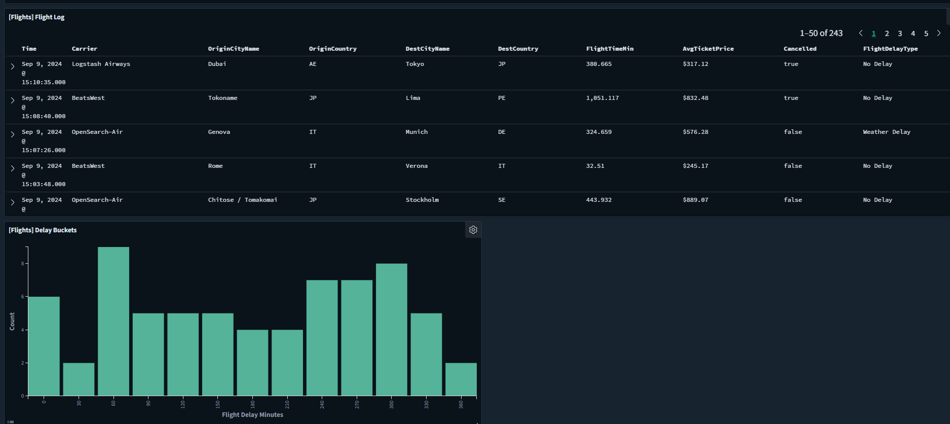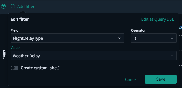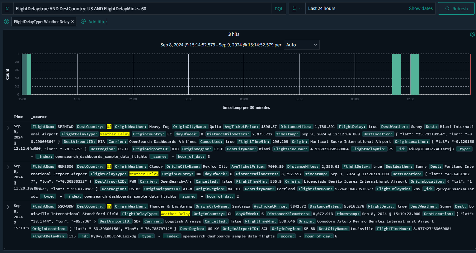 FlightDelay:true AND DestCountry: US AND FlightDelayMin >= 60
