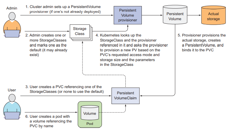 클러스터 관리자가 PV provisioner를 배포하고 하나 이상의 StorageClass 객체를 정의해서 개발자가 작성한 PVC요청이 있을 때 마다 새 PV를 생성할 수 있게 한다. PV와 마찬가지로 StorageClass 리소스도 namespace에 속하지 않는다.