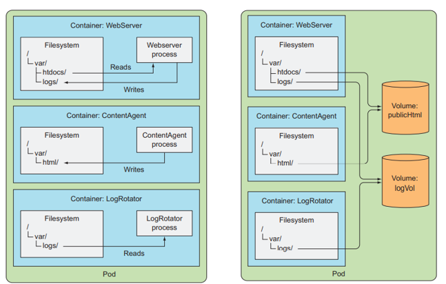 좌측의 각 컨테이너는 잘 정의된 단일 작업을 갖지만 웹 서버가 각 파일에 접근할 수 없다. 공유 디스크가 없는 세 컨테이너로 pod를 생성하는 것은 의미가 없다.