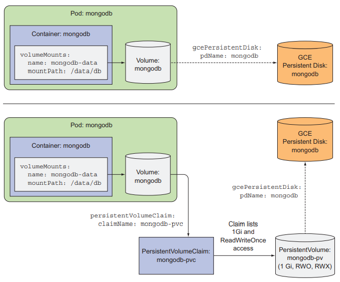 위 그림은 pod가 GCE Persistent Disk를 사용하는 두 가지 방법(직접 연결과 Claim을 통한 연결)