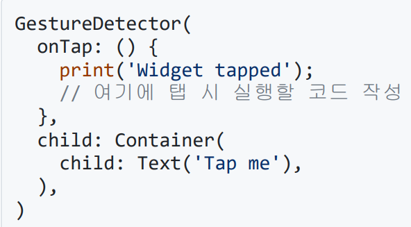 - 여러 종류의 제스처 콜백 제공 (onTap, onDoubleTap, onLongPress)