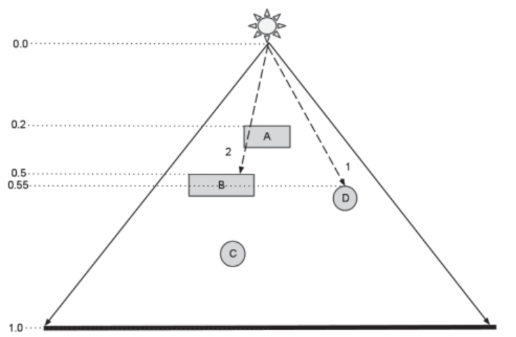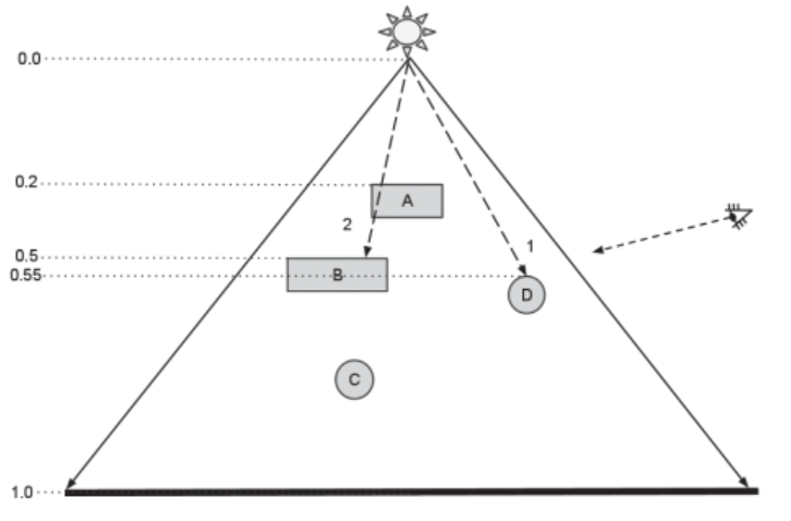 - 그림자 맵에서 물체B의 값(그림자 깊이): 0.2 (A가 첫번째 물체)