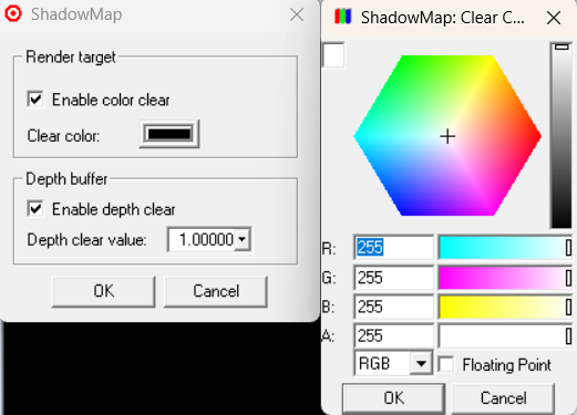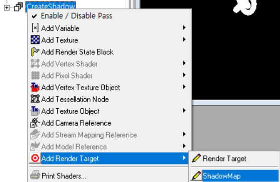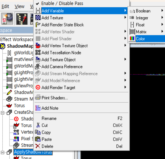 렌더타겟을 추가하고 더블클릭하여 Clear color를 하얀색으로 수정한다. (그림자를 받지 않는 부분을 하얀색으로 설정)ApplyShadowTorus