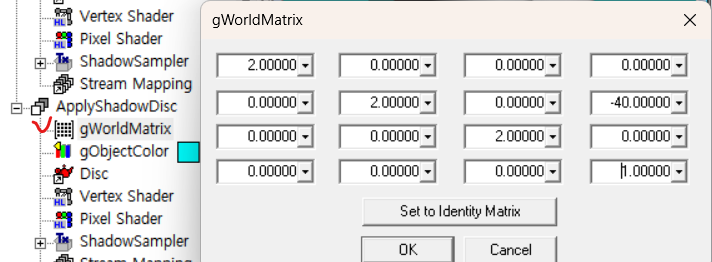 를 만들고 (500, 500, -500, 1)로 설정한다.float4x4 gWorldMatrix;