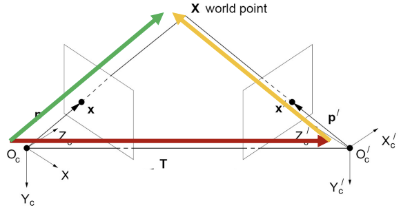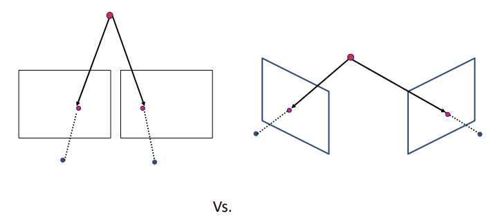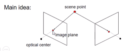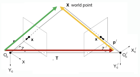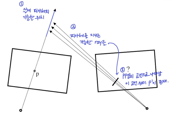 - 두 pp에서 같은 물체로의 ray가 만나는 점이 실제 3차원에서의 위치