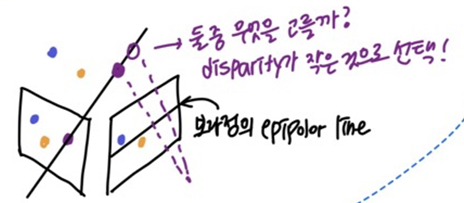 - 한 점의 대응점을 선택할 때, disparity가 작은 점 선택
