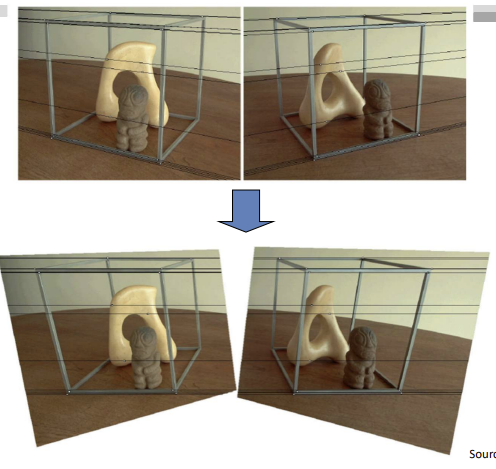 -> Epipolar line이 수평이 되며, 대응점 찾을 때 같은 높이의 scanline에서 찾으면 된다