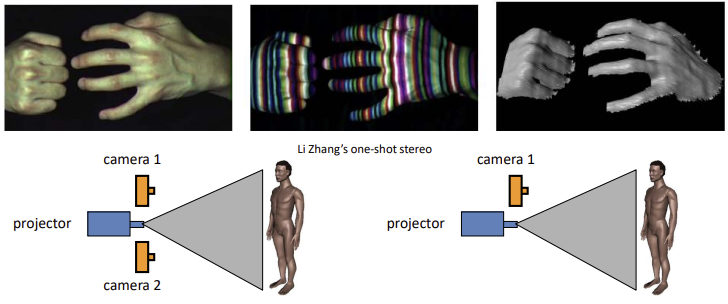 - textureless한 부분의 대응관계를 찾기 위해 프로젝터로 structed light를 쏴서 texture가 나타나도록 함
