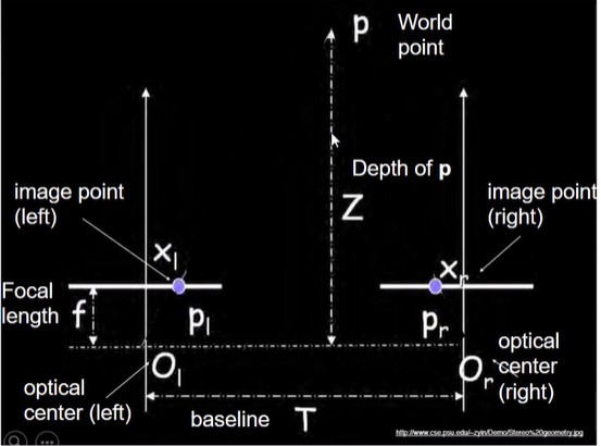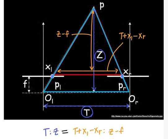 - 이때, xr−xl = Disparity (카메라를 이동했을 때, 한 피사체가 이미지에서 움직인 양)