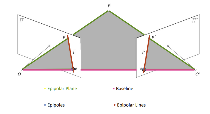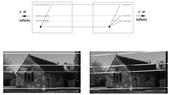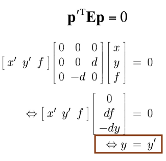 - y값이 같은 line이 epipolar line이므로, corresponding point는 같은 horizontoal line에 존재함을 알 수 있다