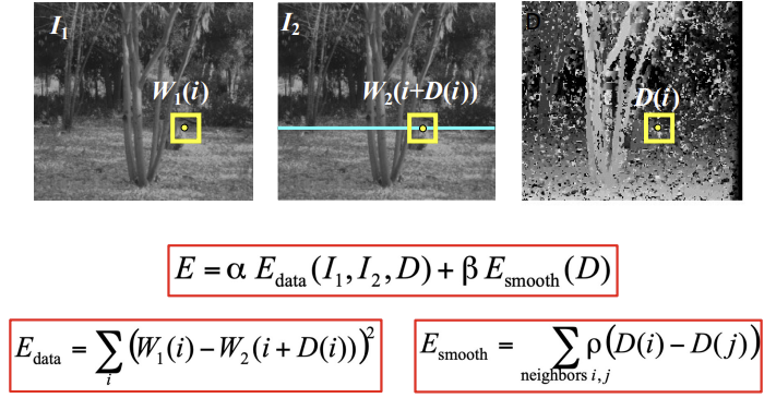 - 각 픽셀에 대해 independent(loca)하게 수행하던 window 방법과 다르게, 위의 조건(non-local constraint)이 들어가 픽셀들의 dependent한 성질(coherence)를 고려하여 매칭