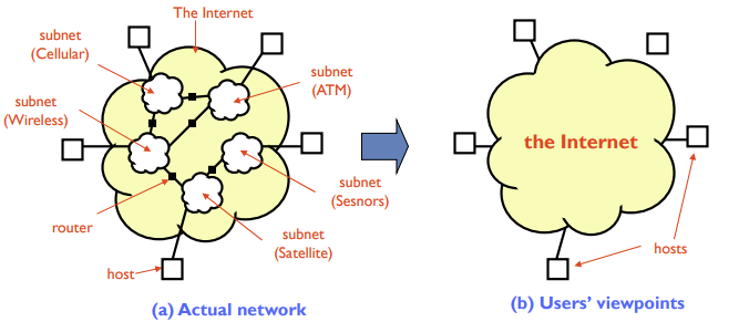 - 유저의 관점에서는 Host들이 하나의 큰 네트워크인 "인터넷"을 통해 연결되어있는 것처럼 보인다.