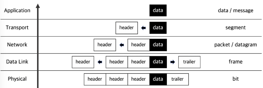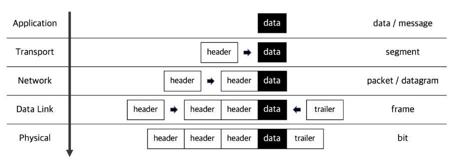 - 데이터 송신; Application에서 처음 요청 데이터가 생성되고 하위 계층으로 전달되면서 헤더가 첨부됨