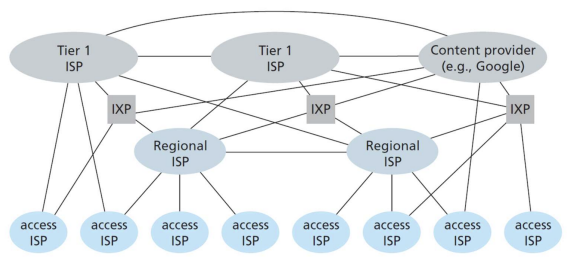 - Core 네트워크의 라우터들은 각 지역/나라/학교 마다의 ISP(Internet service providers)로 연결되어있다. (복잡한 구조)