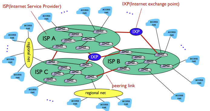 - 각 국가, 지역마다 여러개의 ISP가 존재하며, ISP끼리 물리적으로 연결되기도하고, IXP(Internet exchange point)로 연결되기도 한다.