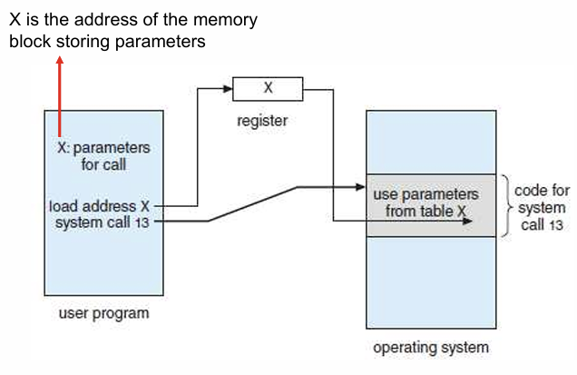 2. 파라미터들은 메모리의 블록에 저장되고, 그 블록의 주소를 레지스터로 전달 (Linux, Solaris)