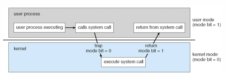 - 하드웨어의 mode bit로 kernel, user mode 설정