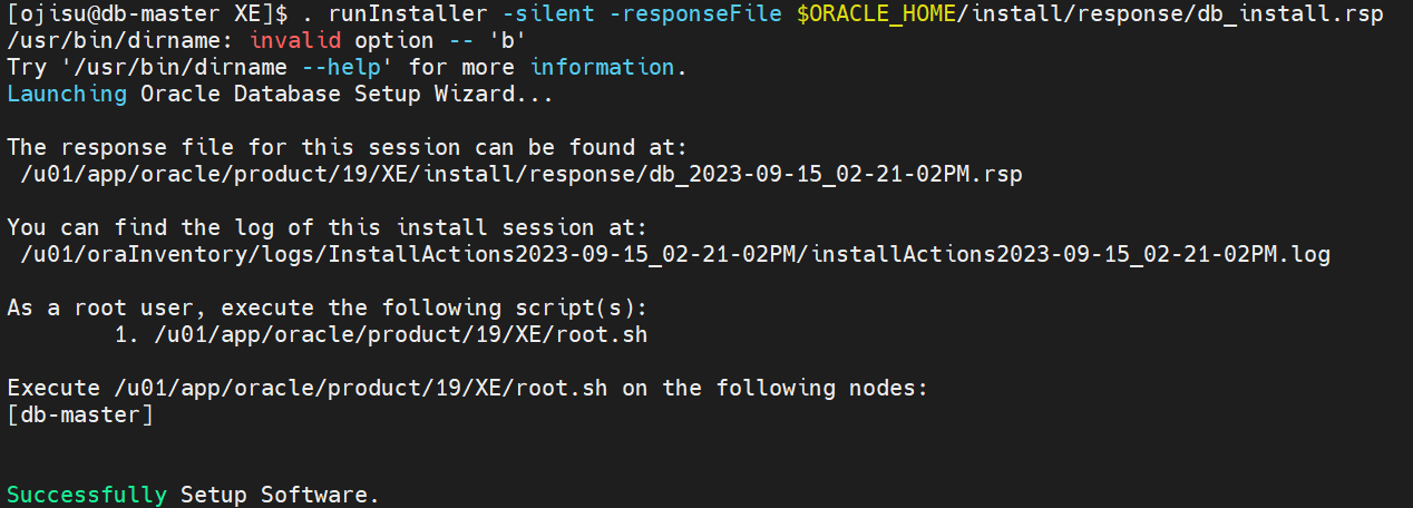 [ojisu@db-master XE]$ . runInstaller -silent -responseFile $ORACLE_HOME/install/response/db_install.rsp /usr/bin/dirname: invalid option -- 'b' Try '/usr/bin/dirname --help' for more information. Launching Oracle Database Setup Wizard... The response file for this session can be found at: /u01/app/oracle/product/19/XE/install/response/db_2023-09-15_02-21-02PM.rsp You can find the log of this install session at: /u01/oraInventory/logs/InstallActions2023-09-15_02-21-02PM/installActions2023-09-15_02-21-02PM.log As a root user, execute the following script(s): 1. /u01/app/oracle/product/19/XE/root.sh Execute /u01/app/oracle/product/19/XE/root.sh on the following nodes: [db-master] Successfully Setup Software.