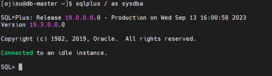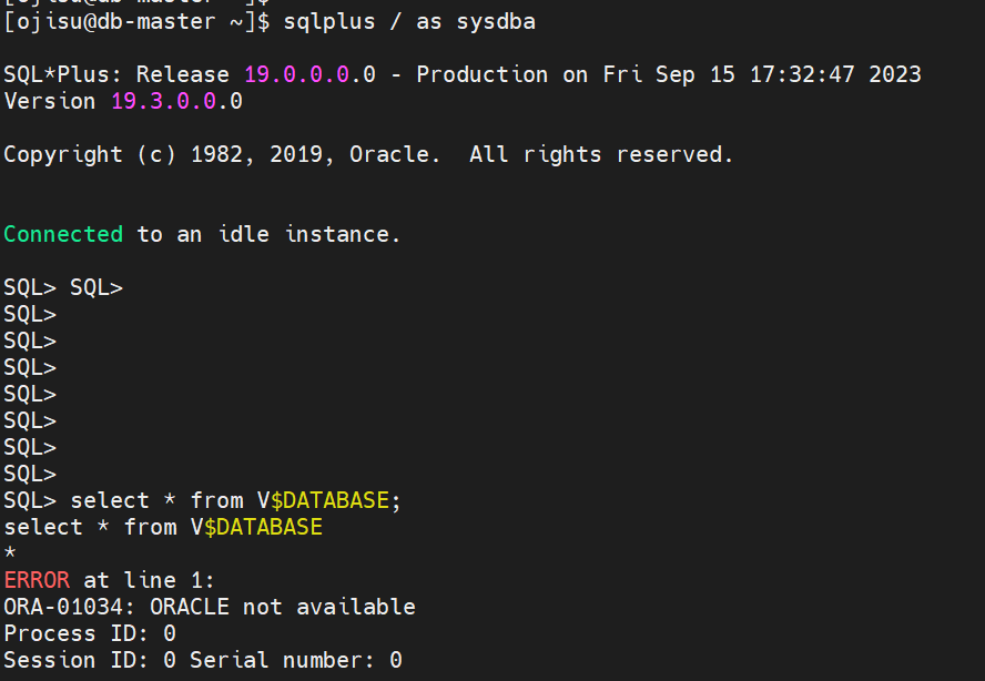 [ojisu@db-master ~]$ sqlplus / as sysdba SQL*Plus: Release 19.0.0.0.0 - Production on Fri Sep 15 16:21:35 2023 Version 19.3.0.0.0 Copyright (c) 1982, 2019, Oracle. All rights reserved. Connected to an idle instance. SQL> startup ORA-01078: failure in processing system parameters LRM-00109: could not open parameter file '/u01/app/oracle/product/19/XE/dbs/initXE.ora'