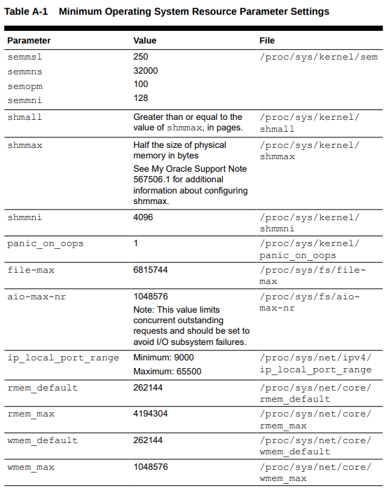 위의 표를 참고하여 파라미터 값을 수정해준다.kernel.sem = 250 32000 100 128 kernel.shmall = 484966 #shmmax / 페이지 사이즈 kernel.shmmax = 1986422374 #물리메모리 절반 byte값 kernel.shmmni = 4096 #세그먼트 개수 fs.file-max = 6815744 net.ipv4.ip_local_port_range = 1024 65000 net.core.rmem_default = 262144 net.core.wmem_default = 262144 net.core.rmem_max = 4194304 net.core.wmem_max = 1048576