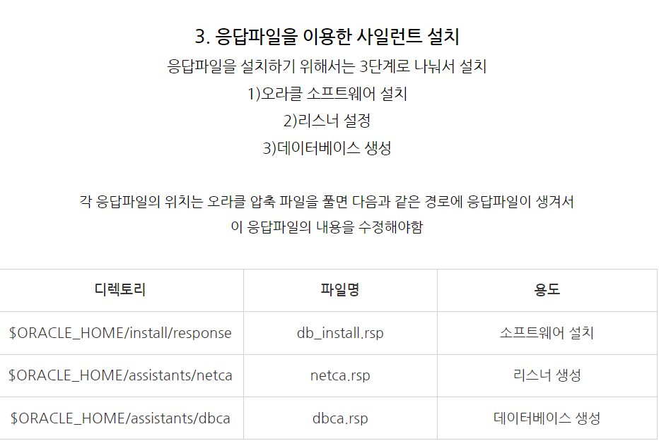 이런 입력정보를 미리 파일로(*.rsp) 만들어놓고, 설치시에 옵션으로 준다면 설치를 자동화할 수 있다.$ORACLE_HOME/install/response