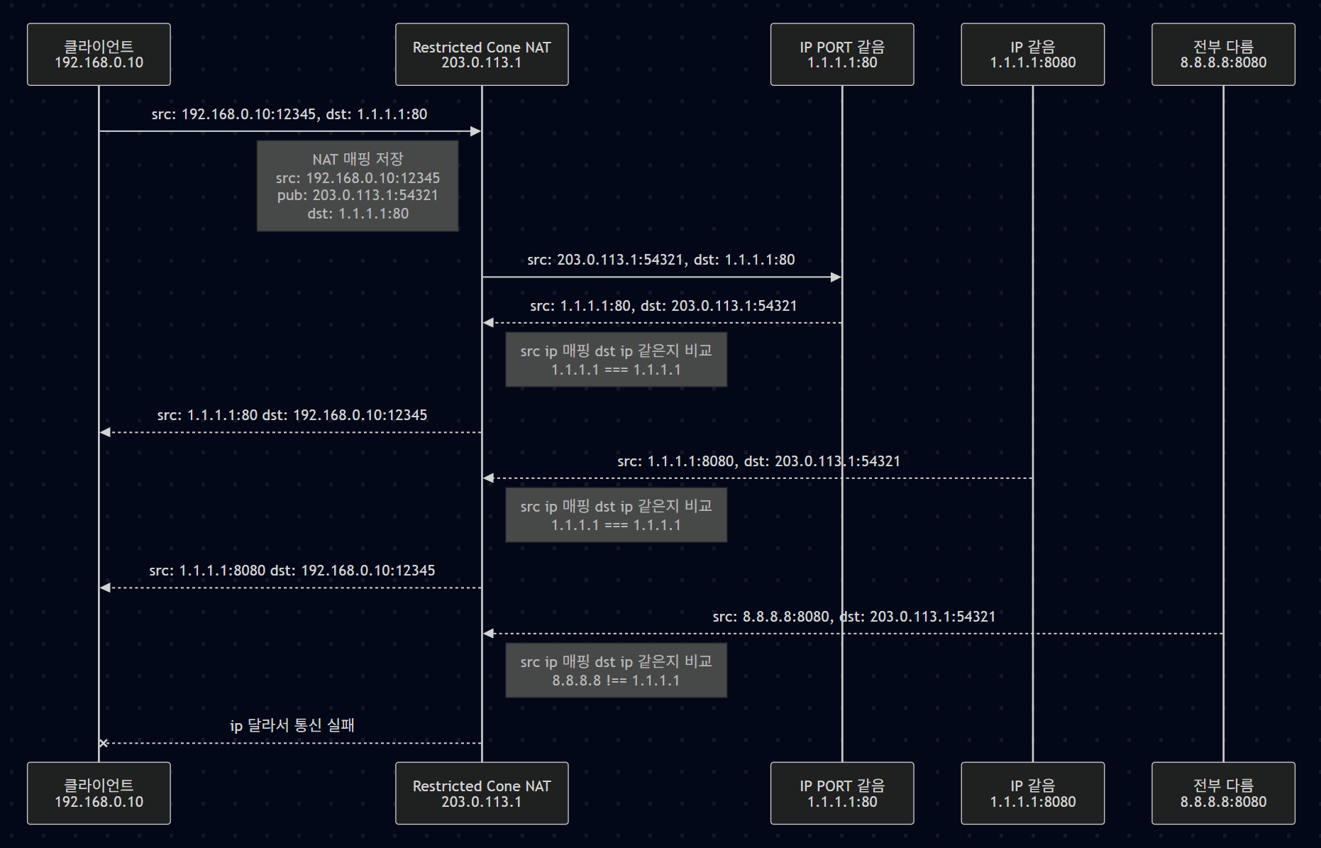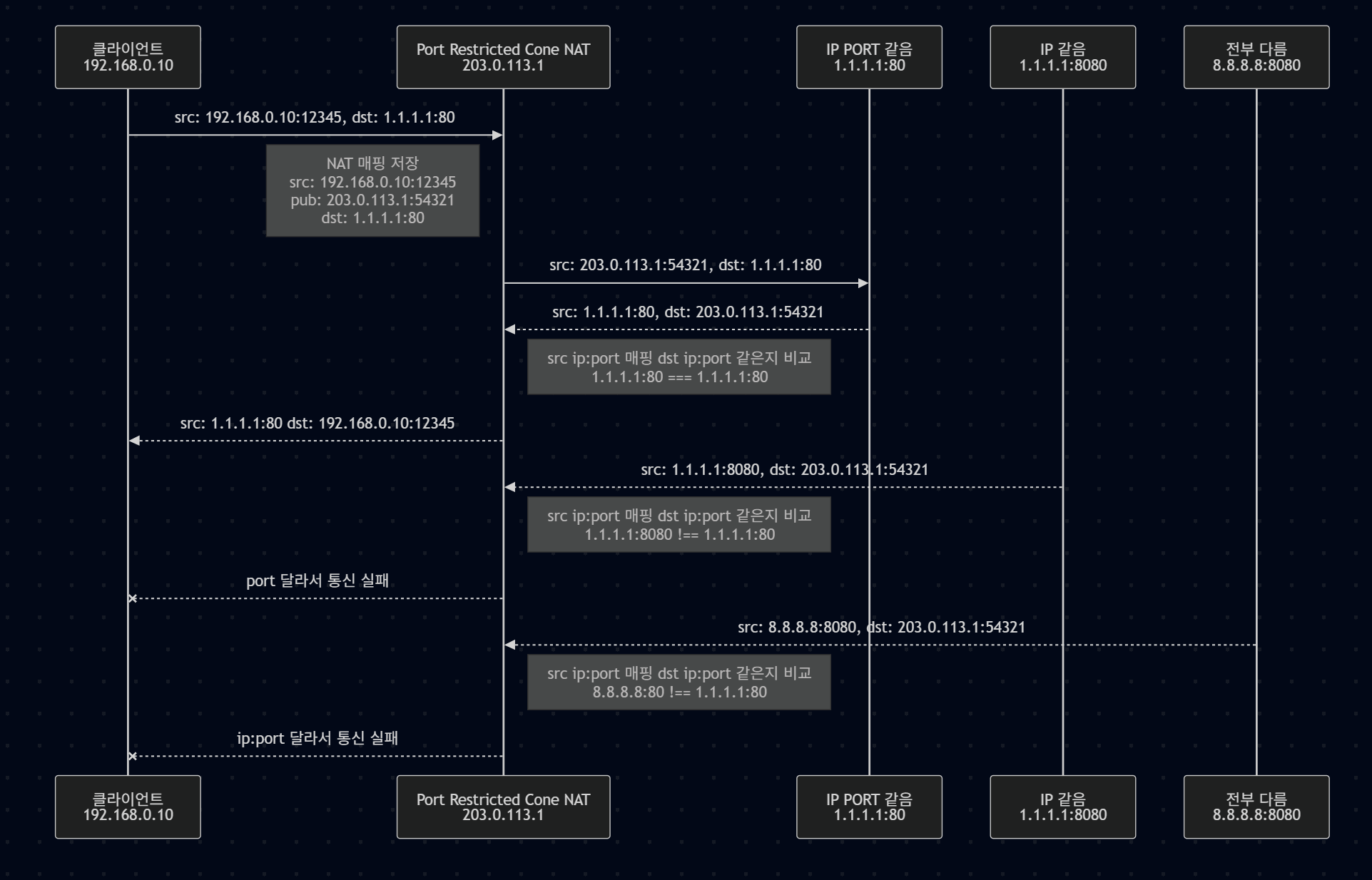 - 기본적으로 Port Restricted Cone NAT과 비슷하게 동작