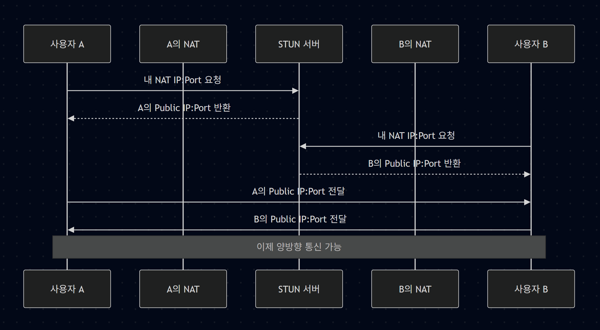 - STUN 서버로 private ip:port와 NAT public ip:port 매핑