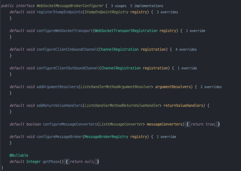 이 인터페이스를 통해서 우리가 웹소켓과 STOMP 메시징을 커스터 마이징 할 수 있다. 내부 메서드 중 사용한 configureMessageBroker 과 registerStompEndpoints 를 자세히 살펴봤다.